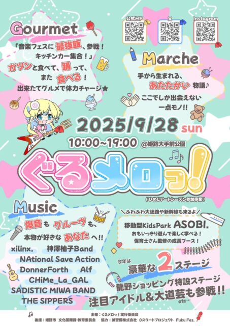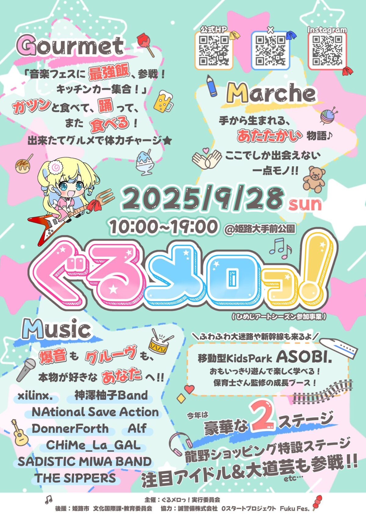 姫路のシンボル・大手前公園で、音楽とグルメとマルシェを一度に楽しめるフェスティバル「ぐるメロっ!2025」が開催されます。バンドフェスでは、xilinx.や神澤柚子Band、NAtional Save Action、DonnerForth、Alf、CHiMe_La_GAL、SADISTIC MIWA BAND、THE SIPPERSといった個性豊かなアーティストたちが登場。爆音もグルーヴも存分に味わえるステージが繰り広げられます。さらに龍野ショッピング特設ステージでは注目アイドルや大道芸も参戦し、2つのステージが会場を熱気で包み込みます。